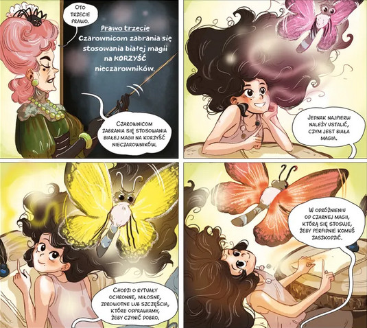 “Czarownica Zora: Tom 3: Biała magia” – Zora i jej babcia, ofiary okrutnego polowania na czarownice, znalazły schronienie na dachu jednej z paryskich kamienic. Zora spędza dnie na lekcjach w szkole, a kiedy wraca do domu, uczy się władać magią. Pod żadnym pozorem nikomu nie może wyjawić istnienia czarodziejskiego świata, w którym żyje.