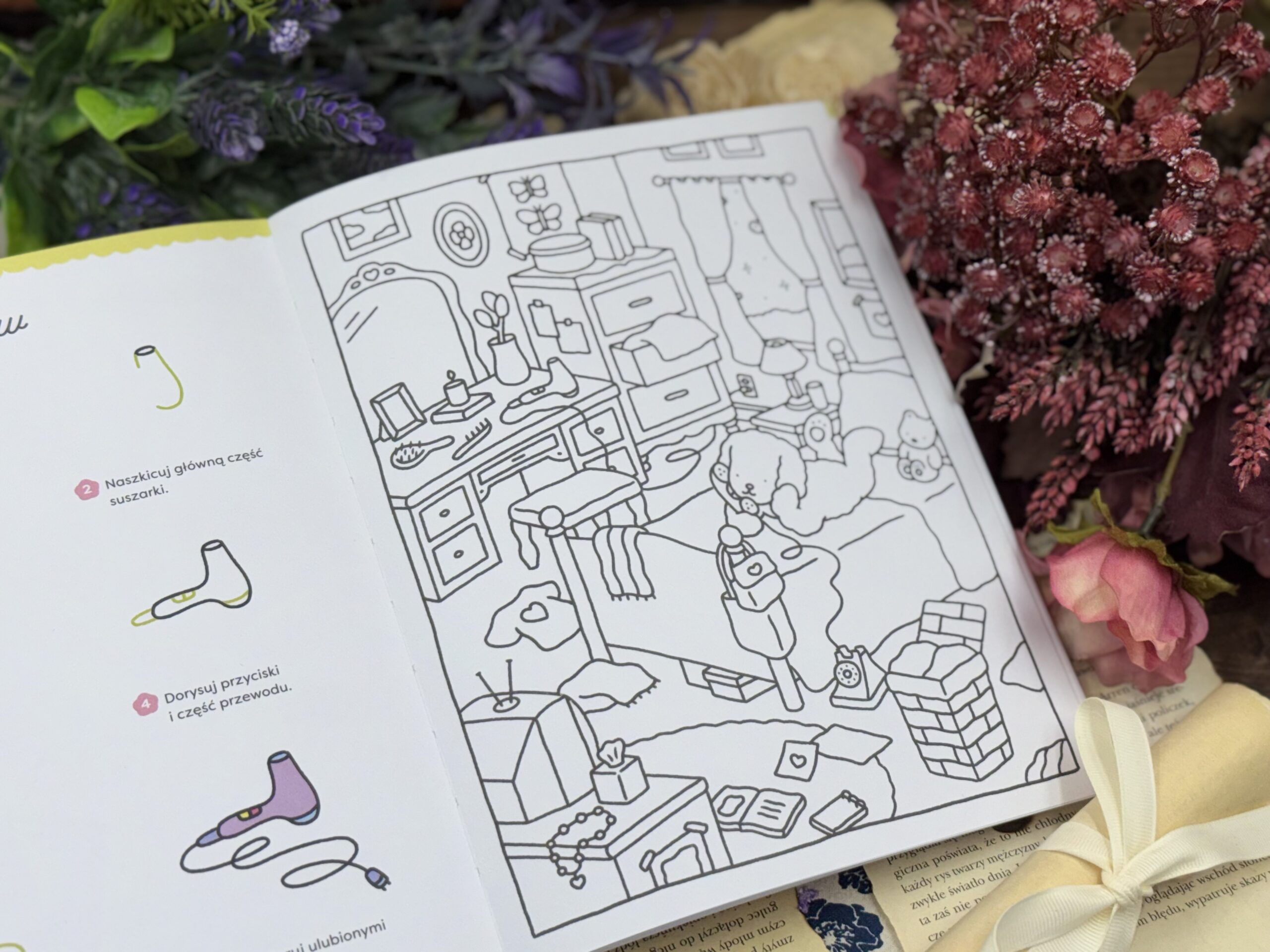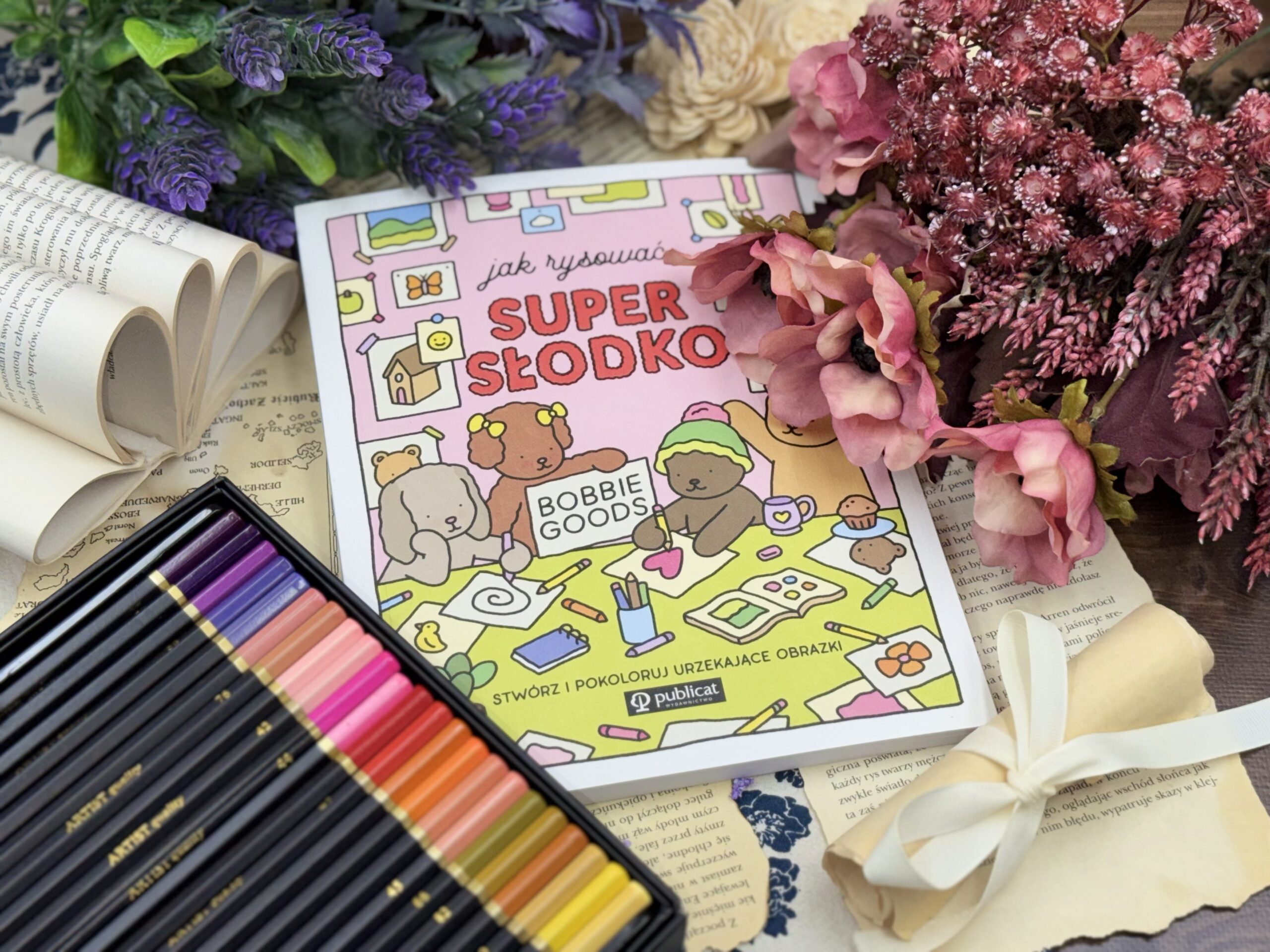 Bobbie Goods, artystka znana z Instagrama i TikToka, prowadzi czytelnika krok po kroku przez swój uroczy, lekko żartobliwy styl. W środku są proste instrukcje, spokojne tempo i wyraźnie rozpisane etapy rysowania. Najpierw podstawowe postaci – pieski, misie, króliczki – potem przedmioty takie jak rośliny, jedzenie, akcesoria czy elementy wystroju. A gdy już złapie się ten rytm, można przejść do projektowania całych scenerii. Kawiarnia, letnie przyjęcie przy basenie, małe wnętrza – wszystko narysowane tak, aby początkujący poczuł, że „też potrafi”. Na koniec pozostaje zabawa kolorem, bo autorka zostawia sporo miejsca na własne interpretacje.