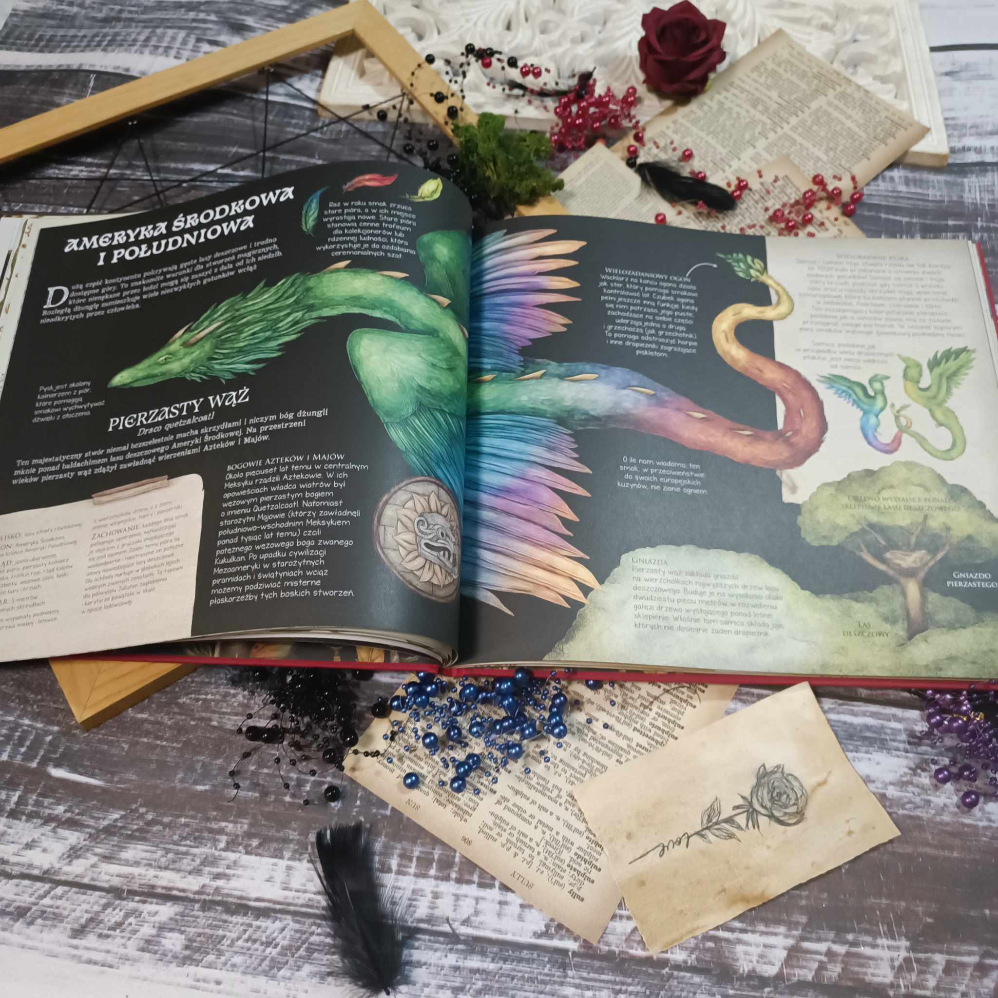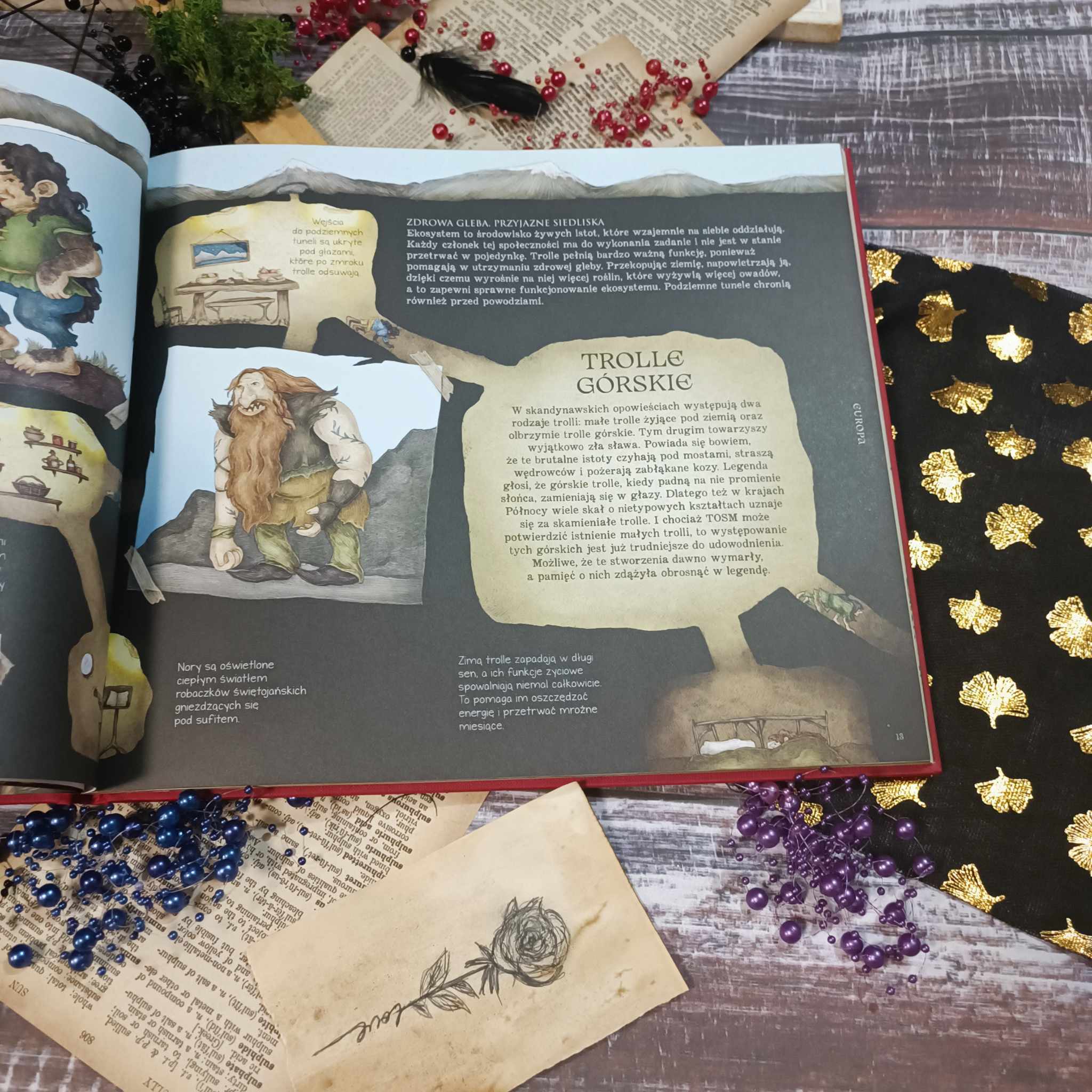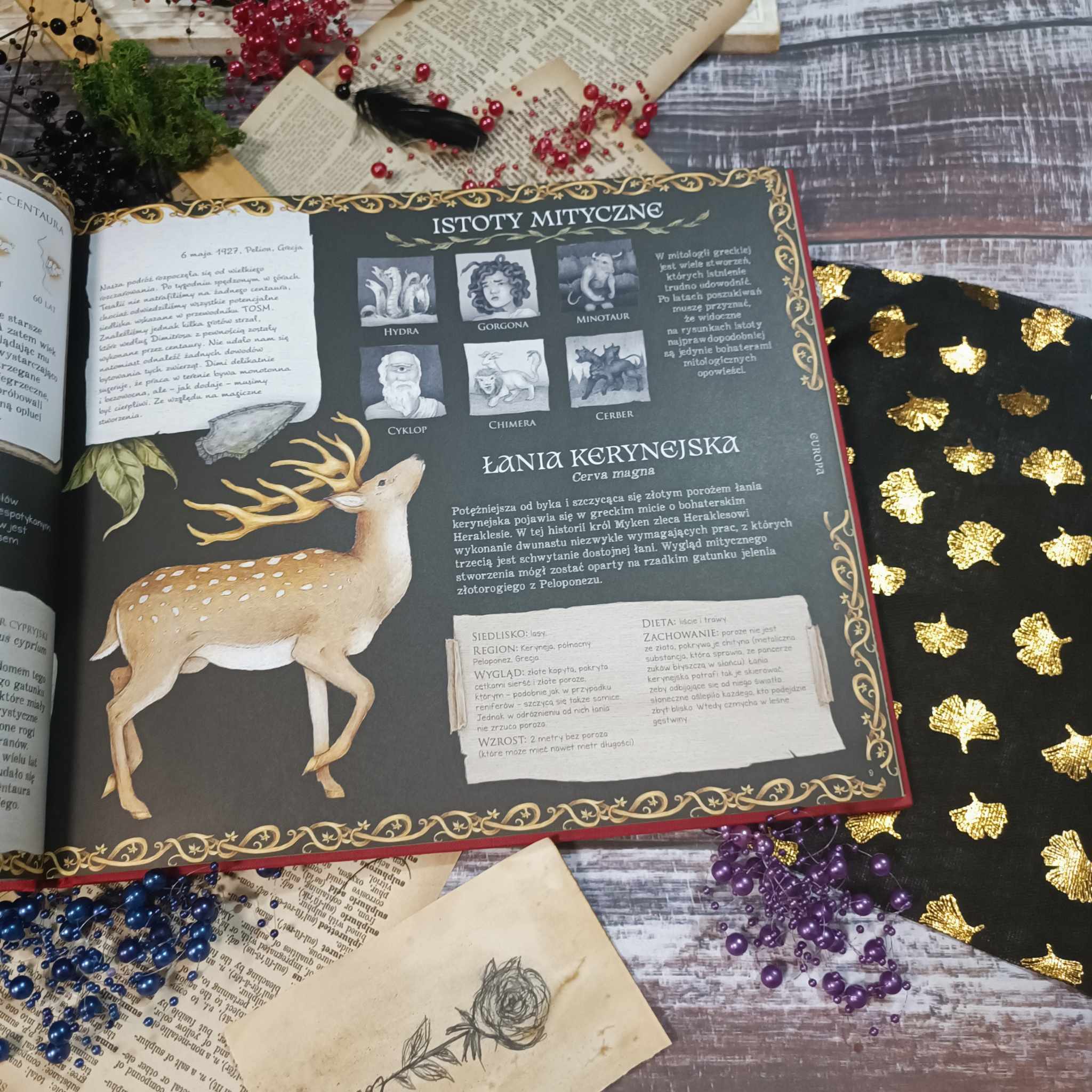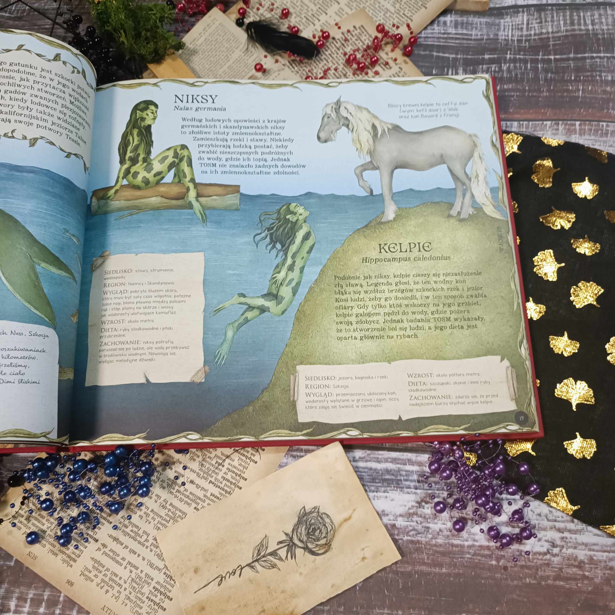 Kocham stare dzienniki, atlasy i wszelkie pamiętniki. To zawsze zbitek wiedzy i emocji, jakie towarzyszyły autorom podczas pisania i zbierania materiałów. Tu poza ogromną dawką tekstu zyskujemy moc obrazu i formy. Jeśli chodzi o ilustracje, to przygotujcie się na wielogodzinne przyglądanie się stworzeniom wszelkiej maści. Kreska jest niezwykła. Naturalna, nieco postarzana, jakby żywcem wyjęta ze szkicowników odkrywców. W każdym obrazku tkwi magia, emocje i tajemnica. Kolory są stonowane, dzięki czemu idealnie łączą się z tekstem i pozwalają się skupić na cechach poszczególnych stworzeń. Strona po stronie, kreska po kresce Jessica Roux i Emily Hawkins przeprowadzają nas przez legendy i mity wielu nacji. Od starożytnych stworzeń po te żyjące w opowieściach współczesnych ludzi. A to wszystko zamknięte w przepięknej twardej oprawie skrywającej strony pełne magii i to nie tylko tej ze złoconych brzegów.