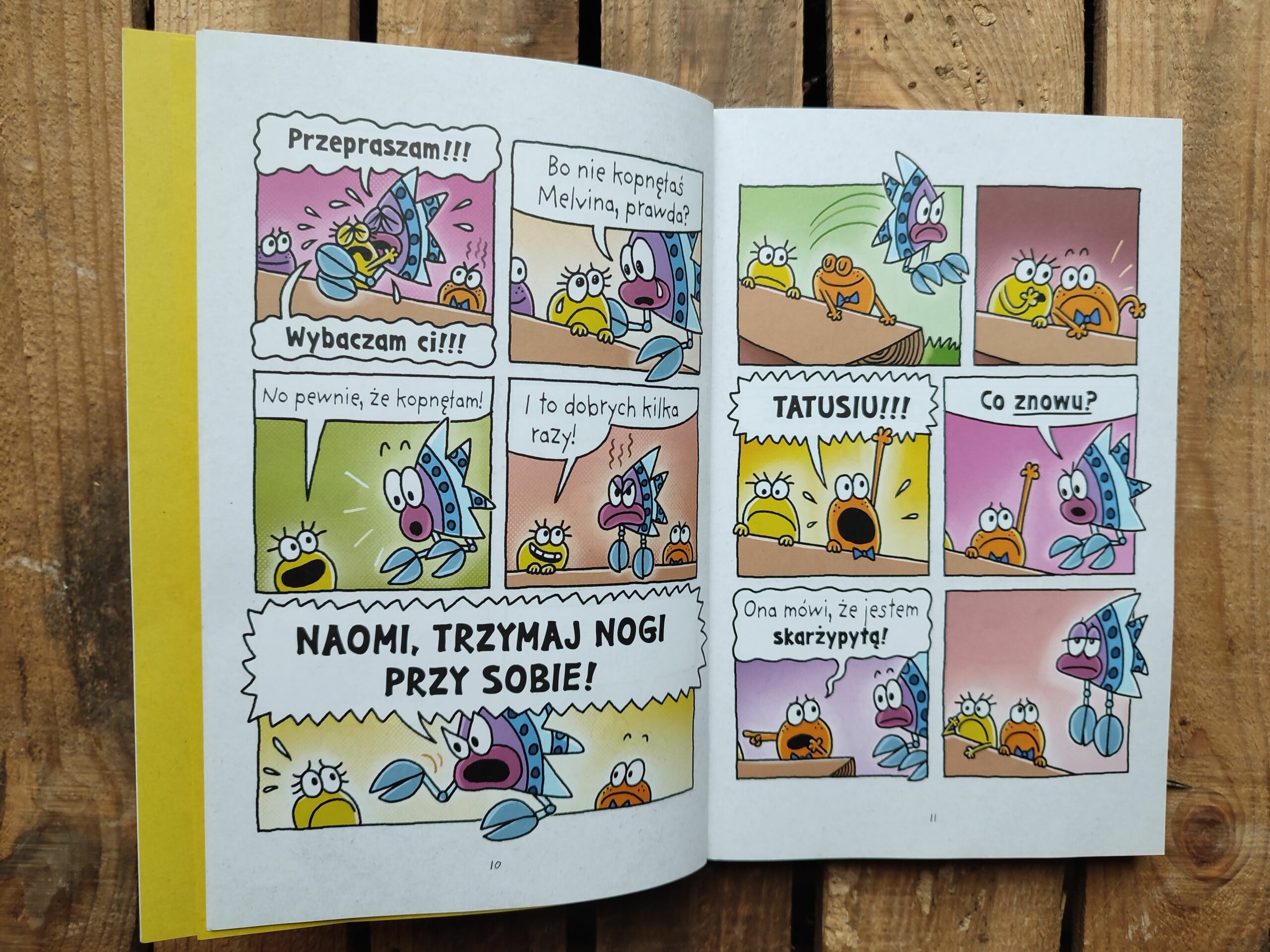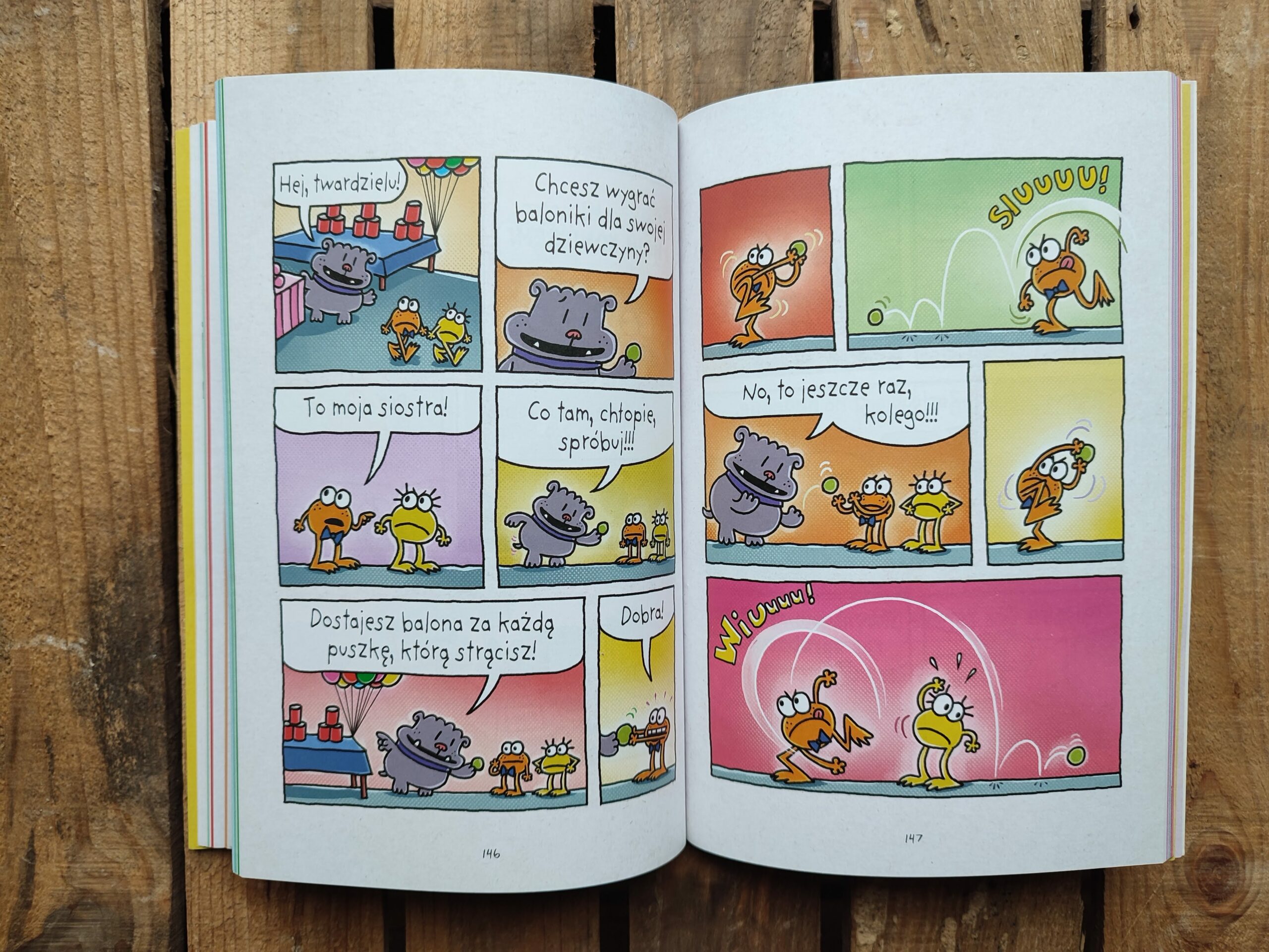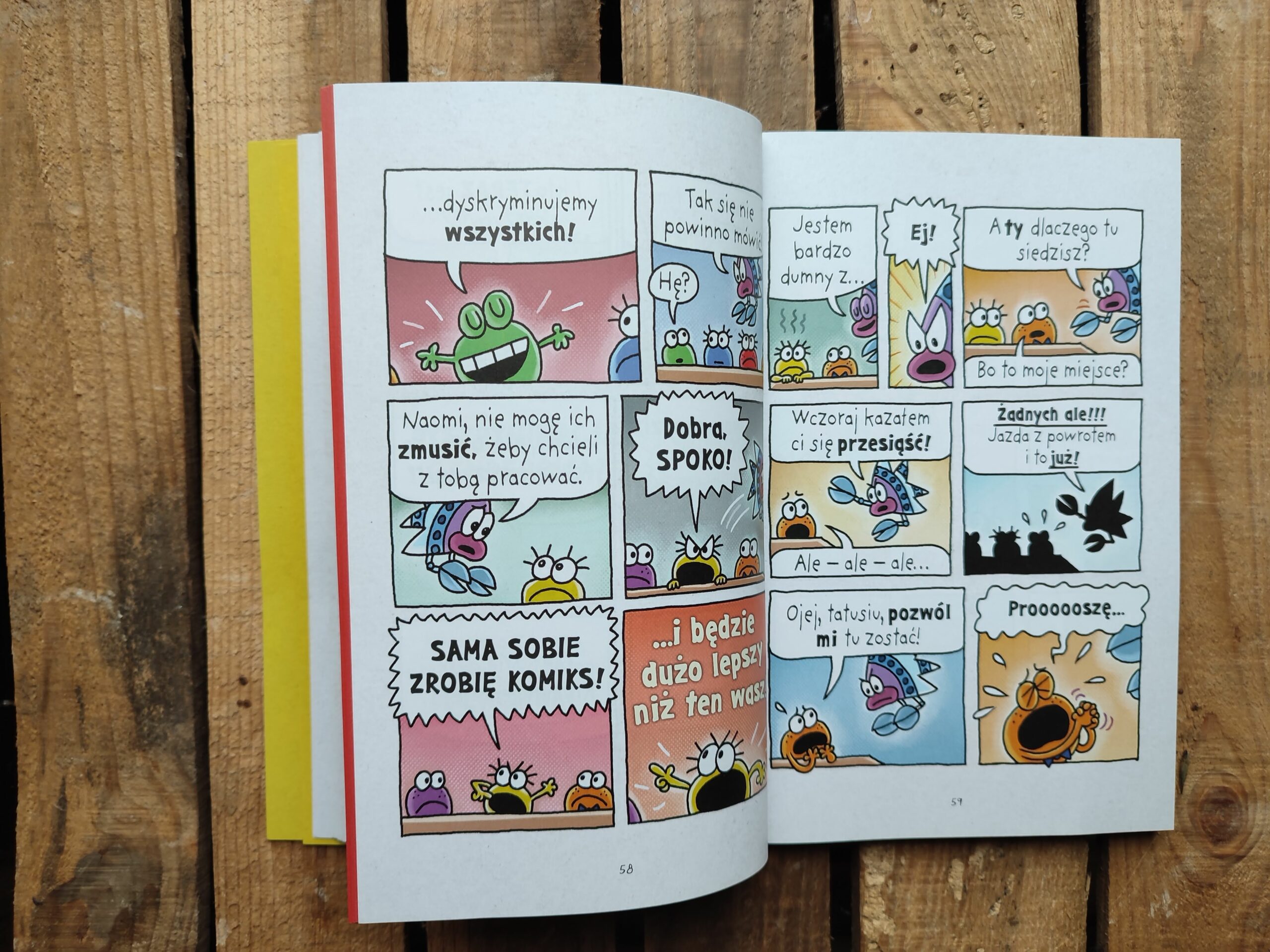 Szalonym wybrykom nie ma końca, a przygody małych żabek okazują się przezabawne i pełne emocjonalnej głębi. Dav Pilkey tworzy minikomiksy w komiksie, stosując rozmaite techniki, takie jak malarstwo farbami akrylowymi, rysunek kolorowymi kredkami, japońska kaligrafia, fotografia, kolaż, gwasz, akwarela i wiele innych – ukazując w ten sposób perspektywę poszczególnych żabek. Stylistyczny kalejdoskop w połączeniu z charakterystycznym dla Pilkeya humorem i darem opowiadania składają się na wybuchowy miks, stymulujący kreatywność, współpracę, empatię i niezależne myślenie. Tą mądrą i radosną opowieścią graficzną zachwycą się czytelnicy w każdym wieku.
