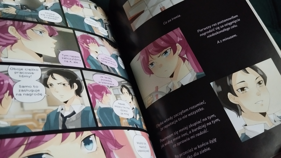 Bo o tym właśnie jest ta manga. O pójściu pod prąd, jeśli ma się ideały, z tym też jest związana pewna tajemnicza książka i jeszcze bardziej tajemnicze morderstwa, o byciu sobą i nieprzejmowaniu się zdaniem innych. O pewnego rodzaju dorosłości i wyborach, które czasem trudne, pozwalają spojrzeć sobie w oczy. A wszystko to ubrane w piękną kreskę i fantastyczne kolory. Każdy rysunek coś wyraża, coś przekazuje, a delikatna zmiana w życiu bohaterów od razu widoczna jest w sposobie ich przedstawienia. Z niecierpliwością czekam na kolejną część, wiedząc, że się nie zawiodę.
